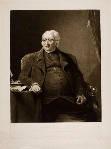 Curator: This is Caroline Cranch's portrait of Frederic Henry Hedge, currently housed in the Harvard Art Museums. It makes an imposing statement. Editor: Yes, an imposing, somber figure. I'm immediately struck by the contrast between the dark clothing and background, and the luminosity of his face. Curator: Note how the composition is anchored by the subject's seated posture, almost daring the viewer to consider the intellectual weight he carries. A book sits on his lap and a classical statue is posed in the background. Editor: The statue surely represents Hedge's deep connection to classical ideals. The book he holds becomes a symbol of knowledge, of course, but also of the weight of intellectual tradition. Curator: Indeed. The artist cleverly uses the interplay of light and shadow to guide the viewer's eye, emphasizing both his age and his enduring presence. Editor: It's a potent visualization of the sitter's authority. The artist gives us insight not just into the man, but into the cultural values he embodies. Curator: It’s a satisfying construction, even without knowing the full context. Editor: Agreed. A portrait that continues to resonate long after the encounter.