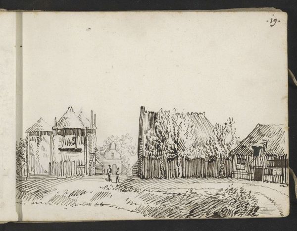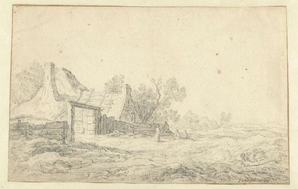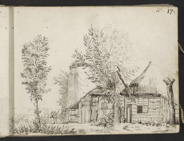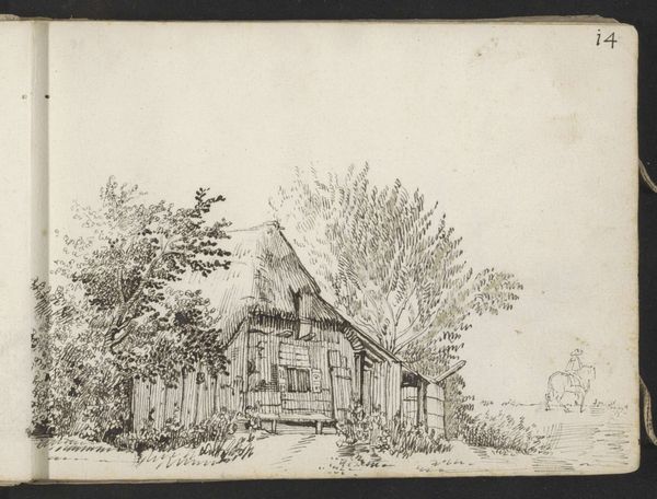 Editor: This pen and ink drawing is entitled "Paardenkar voor een boerenwoning," or "Horse cart in front of a farmhouse," by Gerard ter Borch II, from around 1631 to 1633. It has a kind of humble charm, a raw and unpretentious depiction of rural life. What elements stand out to you, especially given your expertise? Curator: The linear quality immediately captures my attention. Ter Borch uses line weight variation with such deftness. Note the density of strokes that articulate the thatched roof, juxtaposed with the more delicate rendering of the trees. Do you see how this contrast creates a hierarchy, directing the eye through the composition? Editor: I see it. It almost creates texture in the thatch and contrasts with the spareness of the tree branches. The line work definitely brings attention to that architectural detail first. Curator: Precisely. The very intentional structure reinforces a thematic stability. Ter Borch has a command of space despite the minimal use of tonal shading. How do you perceive the relationship between the architecture and the surrounding landscape? Editor: The farmhouse is solid, very defined, compared to the loosely defined trees and wagon. It grounds the image in reality and almost presents nature as more transient. What does that signify about the values he may be encoding through the formalism? Curator: It emphasizes a prioritization of human construction versus the fluidity of nature, or order over nature's spontaneity, which are frequent tropes found within 17th-century Dutch landscapes. Ter Borch carefully modulates the density of ink to simulate depth, a crucial technical component in establishing pictorial space. Notice how, despite the sketch-like quality, he's deeply attentive to proportion, to constructing a believable perspectival recession. That balance between precision and looseness—how does that inform your interpretation of the work's meaning? Editor: I guess I saw the roughness first, and I didn't fully consider how strategically it might be applied. I see a planned structure now that you have pointed it out, not just a simple rural scene. Thanks, that really helps! Curator: Indeed. Every formal element becomes a signifier, pointing towards the artist's intention, in grounding the Dutch landscape as a construct, carefully composed rather than merely observed.