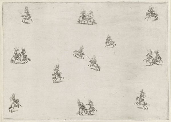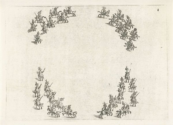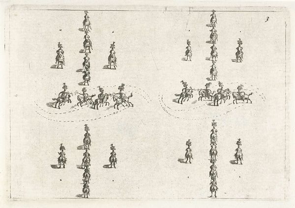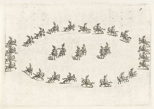 This is Nikolaas van Hoy’s, "Beweging van ruiters", made sometime in the 17th century. What strikes you immediately is the sinuous line created by the procession of riders. The monochromatic etching uses delicate hatching to define the forms and ground. The composition, dominated by this sweeping curve, presents a dynamic yet controlled sense of movement. We see the riders, each rendered with careful detail, follow a semi-circular path that fills the frame. This creates a sense of continuous action, almost like a study in motion. The riders' formation suggests a kind of structured performance. In semiotic terms, we might interpret their circular path as a sign of ritual or ceremony, where the repetition and order convey power. Consider how the scale is used to emphasize pattern and rhythm, perhaps reflecting contemporary philosophical concerns with order. Note how the artist utilizes linear precision to create a sense of depth and motion. This challenges our perception, blending art with a symbolic language of movement and societal structure.