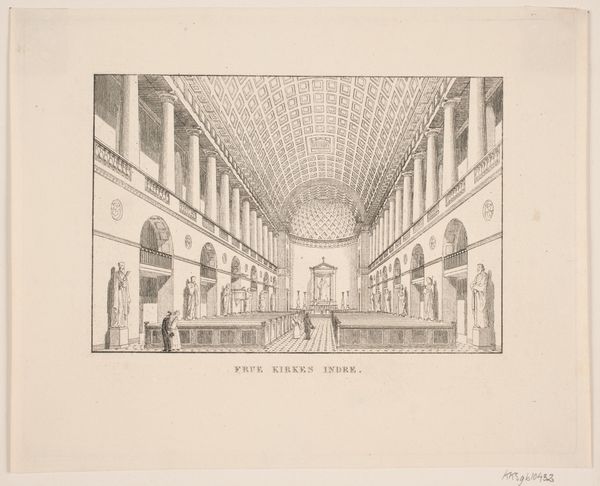 Curator: Here we have a print dating from approximately 1752 to 1789. It's by Caspar Jacobsz Philips, and it's titled "Interieur van de Friese Doopsgezinde kerk 'de Arke Noach' te Amsterdam" or, in English, "Interior of the Frisian Mennonite Church 'Noah's Ark' in Amsterdam." It’s currently housed at the Rijksmuseum. Editor: It’s so austere! Almost oppressively serene. The subdued lighting makes the space feel vast, but also…empty? What did you say the artist’s name was? Curator: Caspar Jacobsz Philips. The print is an engraving on paper, and you’re right; the use of perspective is remarkable, drawing your eye deep into the architectural space. I think the limited color palette amplifies that sense of austere Dutch Protestantism. Consider the labor involved in creating such a detailed interior view using the engraving process at this time. It’s meticulous. Editor: Absolutely, you can almost feel the engraver's hand, carefully etching those lines. It feels very controlled and precise, almost like a technical drawing, but softened by the figures near the foreground who almost seem surprised by their own presence within this imposing grid. It's a glimpse into another time and place, right? What do we know about this specific church? Curator: “De Arke Noach,” Noah’s Ark, was indeed a real Mennonite church in Amsterdam. Images like these were popular in the Dutch Golden Age, a period when the mercantile class asserted its prominence, partly through architectural display. Editor: It’s funny, because knowing it's called Noah’s Ark gives the image this submerged quality, that combined with all those windows makes it feel somehow fluid, as though you're both inside and also contained, or possibly adrift... Maybe that’s the point? To convey a sense of spiritual protection? Curator: Perhaps! The artist’s emphasis on clean lines, light, and overall spatial representation of civic architecture reveals the material aspirations and aesthetic values of Dutch society in the 18th Century. I think Philips captured something enduring in this work. Editor: I agree. This piece is more than just a pretty interior shot of a building. It really does speak volumes about faith and perspective and, the almost mathematical desire for an absolute sense of space and place in the world, not to mention the labor necessary to make that tangible for the every viewer. It's captivating.