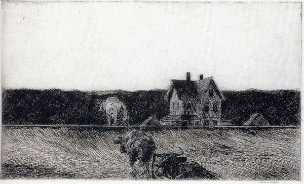 Curator: This pencil drawing by Georges Seurat, titled "Landscape with Houses", was created around 1881 to 1882. Editor: My first impression is one of quietude, perhaps even melancholy. The contrast between the densely shaded foreground and the lightly rendered houses creates a very somber mood. Curator: Indeed. The heavy use of chiaroscuro is striking. Consider how Seurat, even in this early work, is already exploring the interplay of light and shadow. This technique will become a signature of his later, more well-known paintings. What I find remarkable here is the seemingly simple composition, its grounding in realism notwithstanding, conveys this impression of intense spatial organization. Editor: I agree, but what interests me most is how the drawing hints at the burgeoning urbanization and industrialization of France at the time. These houses, while seemingly bucolic, likely represent the encroaching suburban landscape that was transforming French society. Are we looking at idealized or documentary evidence? The social forces shaping this imagery ask whether the people living there found the transformation peaceful or melancholic too. Curator: That’s a fascinating interpretation! Thinking purely about form, look at how Seurat uses the vertical lines of the lone tree to bisect the composition, guiding our eye toward the cluster of houses, subtly disrupting the traditional landscape convention of an open foreground. Editor: Disrupting perhaps but it also asks questions of social and political space. The solitary tree serves as an urban marker. This period saw the rise of modern urban planning and debates about the nature of community. I mean, it’s striking how even such a seemingly straightforward drawing resonates with these concerns, of land ownership and space use and how that has shaped where and how people live! Curator: Yes, the placement and line quality generate a sense of dynamism. He uses short, choppy lines to suggest texture and depth. What may be called visual simplicity and understated complexity, I guess! Editor: The context provides more nuance than one may suspect. Thinking of space like this really underlines the dialogue between what’s inside of that lived home space and whatever that outside urban infrastructure looks and feels like for people, right? Curator: Exactly, I didn't look at the picture like that before! Editor: Always another opportunity to expand an existing appreciation.