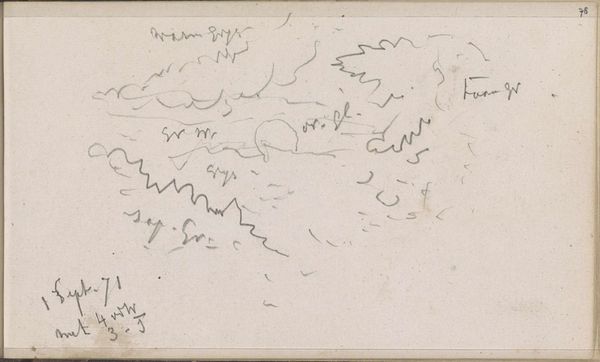 Curator: We're looking at "Dennenbos aan een rivier," or "Pine Forest by a River," a pencil drawing created in 1848 by Johannes Tavenraat, housed here at the Rijksmuseum. Editor: Immediately, I'm struck by the airy quality. The density of pencil strokes varies greatly, creating a hazy, almost dreamlike, atmosphere. It feels incomplete somehow. Curator: In the mid-19th century, artists like Tavenraat were turning toward landscape to explore themes of nationalism and identity, linking the Dutch spirit to the land itself. Editor: I see that, but the way Tavenraat handles light is also noteworthy. The sparse lines emphasize the luminosity of the sky, drawing the eye upwards and outwards. The textures created are delicate; he really knows how to use line weight. Curator: The Romantic movement, so powerful at this time, encouraged this kind of return to nature but also emphasized feeling. Consider the Netherlands’ colonial legacy: land became a fraught symbol. To represent it, and in this style, must have meant something very specific. Editor: Possibly. However, notice how the minimal detail forces the viewer to complete the image. There's a very considered use of negative space which provides as much, if not more, meaning as the pencil marks themselves. The implied narrative leaves an element of open-endedness, a characteristic, that shouldn’t be easily dismissed as representational. Curator: Yes, but let’s not overlook how the emerging Dutch national identity, rooted in its landscapes, was complex, shaped by colonial ventures and a strict class hierarchy. Even simple landscapes became charged, embodying more than simple scenes. This piece reflects a search for roots while glossing over some painful contradictions in Dutch society. Editor: Interesting how these marks on paper continue to encourage conversation. Curator: Precisely! Bringing the social context into conversation with these images really brings to light hidden dimensions.