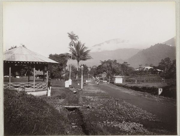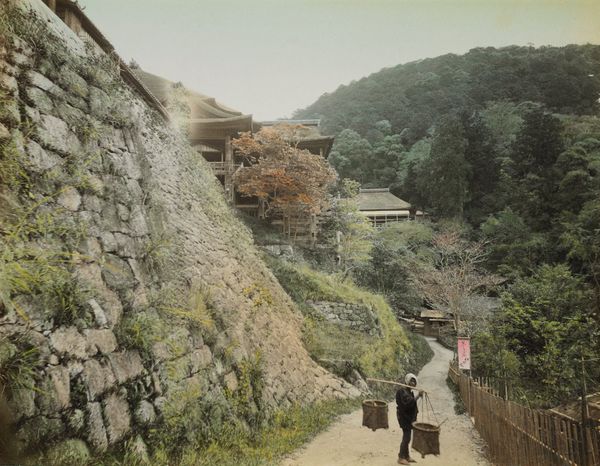 Editor: This is "952 View of Tonosawa" by Kusakabe Kimbei. I’m immediately struck by how the figures on the bridge seem to be performing for the camera. What's your read on this piece? Curator: It’s fascinating how Kimbei is playing with the idea of staged authenticity. These photographs were often marketed to Western tourists, constructing an image of Japan that fit their expectations. Notice the careful arrangement – it’s less a candid snapshot and more a constructed representation of Japanese life. Editor: So, it's a performance of Japan, made for outsiders? Curator: Precisely. It raises questions about the power dynamics inherent in who gets to represent a culture and for what audience. Think about how this image might have shaped perceptions of Japan at the time. Editor: That really makes you consider the layers of representation at play. Thanks for pointing that out!