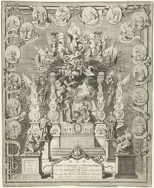 Editor: So, this is *The Arminian Testament* by Claes Jansz. Visscher, made around 1618. It's an engraving, a really detailed ink drawing. It's incredibly intricate and busy. There is almost too much to look at. What jumps out to you? Curator: Well, it screams socio-political commentary, doesn't it? Visscher places the Arminian debate right into the heart of Dutch society. It isn't just a religious dispute. He uses this visual pyramid to structure arguments and associate groups, but is it successful in reaching the public? Editor: What do you mean by the 'Arminian debate'? Curator: Arminianism was a theological movement that challenged strict Calvinist doctrine. Think of it as a struggle for religious and political power within the Dutch Republic. And artists jumped right in. Visscher presents a visual argument positioning the players in a power dynamic through printed material that could be disseminated widely. It’s about shaping public opinion through imagery. Do you think a print like this is successful in shaping public opinions and solidifying them, or in creating discord? Editor: It feels very loaded. There's almost too much detail to digest neutrally. Everything feels like it's making a point. It almost feels like propaganda...but perhaps art like this solidified emerging views in the young Dutch republic. The artist makes this quite clear through symbolic structures and characters in the picture! Curator: Exactly! And this print would have circulated widely, influencing perceptions and solidifying positions in the ongoing religious and political turmoil. Understanding the role of art in these debates really illuminates the period’s culture. Thanks, this conversation helped me remember some readings! Editor: Likewise, I learned how sociopolitical turmoil affected even visual compositions like this print!