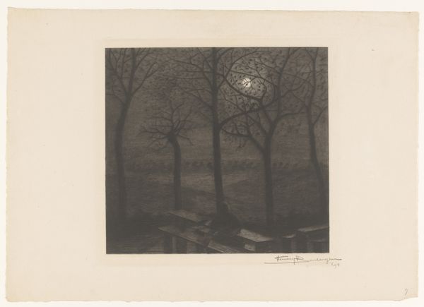 Herman Boulenger produced this etching of a figure at a picnic table in a moonlit landscape sometime between 1890 and 1913. The lone figure is cast against a backdrop of bare trees under moonlight, evoking a sense of solitude. Boulenger was a Dutch artist and part of a generation that grappled with rapid industrialization and urbanization. We might see in his nocturnal landscapes a response to these changes, a retreat into nature and a focus on personal experience. The subtle tonality achieved through etching allowed Boulenger to capture the moodiness of the Dutch landscape, a tradition that stretches back to the Golden Age. To understand Boulenger's work more fully, we might look to the exhibition records of the time, to see how it was received by critics and the public alike. Such contextual details offer invaluable insights into the social and institutional frameworks that shaped both the production and reception of art.