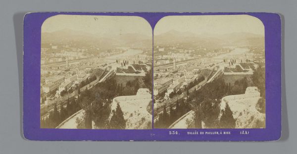This is a stereoscopic photograph of Málaga, taken from the Alcazaba, by Jean Andrieu. The composition immediately strikes you with its layered depth, drawing the eye from the sturdy stone walls in the foreground to the sprawling cityscape, which fades softly into the horizon. The monochromatic palette and grainy texture lend the scene a sense of distance. What's particularly interesting here is how the structure of the photograph itself mimics the spatial relationships it depicts. The stereoscopic format invites a heightened sense of three-dimensionality, echoing the physical depth captured in the view from the Alcazaba. The receding lines of the fortress walls and the tightly packed urban landscape create a visual field ripe for semiotic interpretation. Consider how the photograph plays with perspective and scale. The Alcazaba, a symbol of historical power, anchors the foreground, while the city—a complex network of social and economic activity—stretches into the distance. This juxtaposition engages with ideas of space, power, and representation, challenging fixed meanings and inviting ongoing interpretation. The photograph becomes a site where history, vision, and interpretation converge.
