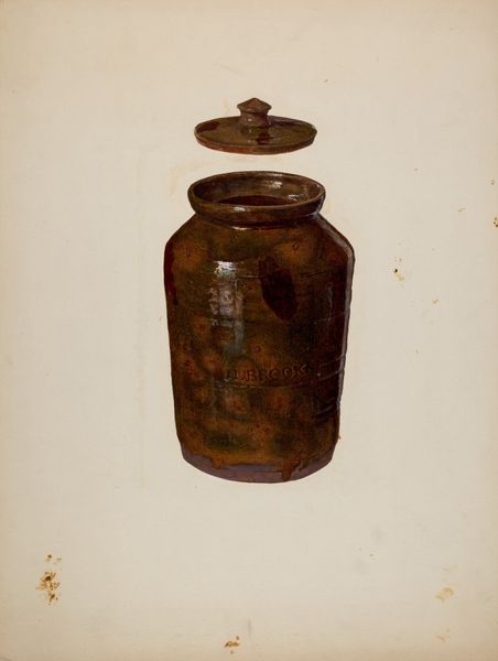 Curator: Let's delve into John Fisk's 1936 drawing, simply titled "Flask." A remarkably realistic rendering, wouldn't you agree? Editor: It has a curious antiquated feel, doesn’t it? Reminds me of a dusty antique shop. Is that rendering on paper, then? I assumed it was ceramic at first. Curator: The artist employed a diverse range of media – charcoal, pencil, coloured pencil and watercolor. I believe it gives that unique sense of depth to the artwork. The flask design, particularly the stylized eagle, appears to evoke specific socio-political sentiments about American identity in that era. Editor: Absolutely. You see the process itself becomes a sort of industrial, ahem, distilling. Those material choices… the layering! It emulates how glass itself is formed, almost an alchemical approach. Were designs such as these mass-produced? That might shine light onto the role of labor during that time period, don't you think? Curator: Quite possibly. It’s not just an aesthetic object. One cannot ignore how design elements in the art reflects public projects, consumption, and national ideals. Editor: And I'm keen on the way Fisk lays down pigment and charcoal to resemble that molten appearance. The brown color palette too suggests clay or dark ale—some of it is even textural through what appears to be pencil! I do wonder what such a container may have held. Was it accessible, expensive, purely decorational? Curator: It's questions such as that which make these kinds of pieces so engaging and necessary for art and design scholarship. Editor: Indeed. Fisk’s drawing goes beyond surface-level aesthetic enjoyment—inviting reflections about cultural values and even economic processes ingrained in everyday objects during its historical moment. Curator: Thank you for adding those points, I couldn't agree more. Editor: Likewise. Thank you.