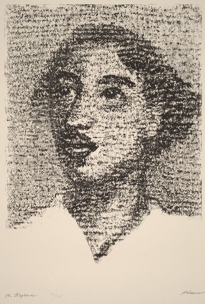 Anatoli Lvovich Kaplan created this lithograph called 'Chave', sometime in the mid-20th century, using a pretty tight, almost granular approach to mark making. Looking at the texture here, I'm reminded that art-making is a process, not just a product. The surface feels almost like a rubbing, built up from tiny marks, a method of layering that gives the image a tangible depth. I imagine Kaplan carefully building up the image, adding density and shadow with each pass. It's pretty clear that the drawing is really the thing here, it has an emotional rawness to it. This textural approach really comes to life around the eyes, it's like the whole portrait is focused in that region. You get a sense of a person emerging from the mist, it puts me in mind of some of the lithographs of Edvard Munch. But where Munch is interested in high drama, Kaplan seems more introspective. There's a quiet melancholy about the work that makes it really affecting. It’s a reminder that art thrives in the realm of uncertainty, where definitive answers are less important than the questions we ask.