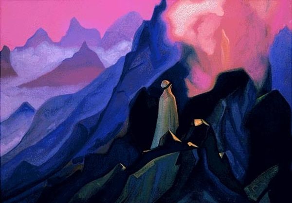 Editor: Here we have Nicholas Roerich's "St. Panteleimon the Healer," and what strikes me first is the sense of quiet humility. The figure is bent over, tending to something small and unseen, set against this vast landscape. What do you see in this piece? Curator: The very image of Panteleimon is laden with historical and cultural weight. Roerich's choice to depict the saint, not in grand iconographic form, but as a humble healer amidst the mountains speaks volumes. The mountains themselves are potent symbols, often representing spiritual aspiration and transformation in Roerich's oeuvre and across many cultures. Consider the symbolism of healing--what does it evoke for you? Editor: A sense of hope, of course. And maybe, the connection between physical well-being and spiritual ascent? Curator: Precisely! Panteleimon wasn't just healing bodies; he was a vessel for faith. The colours too carry symbolic weight. Note the prevalence of blues and purples: colours of spirituality, intuition, and peace, recurring motifs in religious art to depict enlightenment and wisdom. But Roerich's palette veers from traditional icon painting; he presents something more internalized, more personal. This tension contributes to the artwork's captivating, almost dreamlike quality. Editor: That’s fascinating! It’s like Roerich is updating an ancient archetype for a modern, perhaps more secular, world. I really appreciate your insights into how symbols across time play out in this painting. Curator: And I, your keen observation. Remembering how symbols connect us to our collective history helps reveal the depth in any artwork.