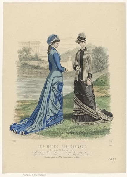 Curator: The artist E. Cheffer created this watercolor print entitled "Revue de la Mode, Gazette de la Famille" in 1881. The image depicts two women in fashionable dresses, set against a backdrop that suggests a sophisticated urban setting. Editor: My initial reaction is one of admiration for the level of detail. The fabrics look luxurious, the lines are crisp, and the colour palette, while muted, speaks to the period's aesthetic sensibilities. I wonder what the realities were of creating dresses like these. Curator: It's intriguing how such fashion plates were circulated through publications. Consider this particular "Revue de la Mode," essentially an early magazine focused on fashion. It would have been distributed widely, shaping ideals and consumption patterns related to textiles and dressmaking across different social strata. Editor: Precisely! We see a snapshot here of the Parisian clothing industry—the labor, the materials sourced from global trade networks. Take, for instance, the bustle on the one dress; the yards of fabric required represent a substantial amount of work in production and also considerable expenditure for the consumer. Were such styles widely available? Curator: While perhaps not widely affordable across all classes, publications like this promoted the *idea* of accessibility. Readers, including seamstresses, could glean inspiration to reproduce or adapt styles for themselves and their clients. The illustration thus played a direct role in circulating fashion trends throughout various social spheres. Editor: And the printmaking process itself is key to understanding its dissemination. The very act of reproducing Cheffer’s watercolor as a print transformed a unique artwork into a standardized, marketable item, available to a much broader audience than the original could ever reach. How was the publication itself distributed, what did it cost, what was the print run? All these aspects shaped its impact on social habits. Curator: Ultimately, this piece provides not just a pretty picture, but a visual entry point into understanding 19th-century fashion dissemination and its related industries, connecting the dots between high art, popular culture, and economic forces at play. Editor: Right, it is fascinating to look beyond the elegant facade of these figures and understand the machinery of design, production, and marketing that underpins the image. The history lies in its materiality and modes of dissemination.
