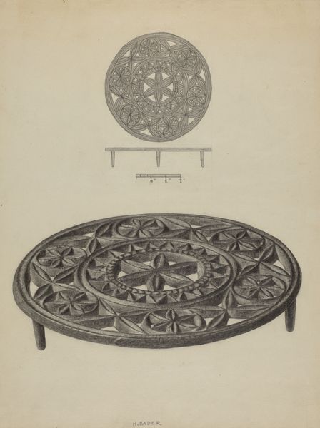Filippo Porreca created this representation of a Pa. German Trivet. Porreca was an Italian artist who documented a range of decorative arts objects made by Americans. The trivet is an object that speaks to the domestic sphere, labor, and the everyday lives of women in Pennsylvania German communities. These communities, often seeking religious freedom, brought unique cultural traditions to America, blending them with new world influences. The design—the series of circles—can be read through the lens of cultural identity. The Pennsylvania German communities often used specific motifs, like the one you see here, which symbolized good luck. As such the trivet embodies the fusion of function and cultural expression, reflecting the community's values and history. Consider the emotional connection to home and heritage that such an object might evoke. It’s a quiet testament to cultural exchange, adaptation, and the enduring human need to create beauty in the face of hardship.