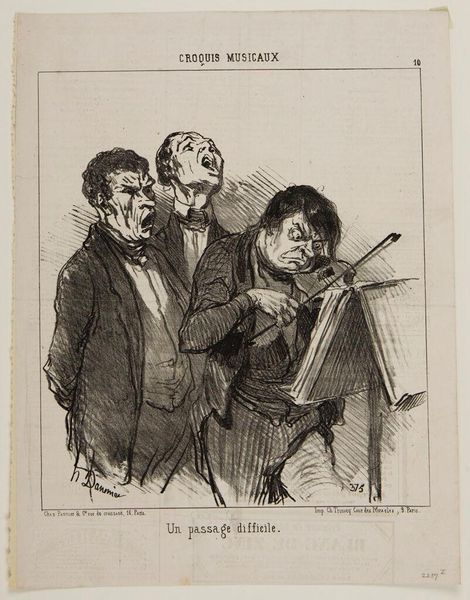 Curator: Daumier's lithograph, "The Bit that One is Obliged to Swallow after Dinner: A Sonata Played by the Daughter of the Musician, a Young Prodigy of Six," presents a domestic scene, likely satirizing bourgeois social rituals. Editor: I see a striking contrast between the wide-eyed expectation of the adult audience and the diminutive figure of the child musician. There is something unsettling in the visual imbalance, in the way the adults loom over her. Curator: The print process itself is critical. Daumier utilized lithography to rapidly reproduce this critique for mass consumption, engaging with contemporary debates about class and artistic labor. Editor: The stark lines and shading contribute to a sense of unease, even grotesqueness, in the faces of the onlookers, while the child seems isolated, almost doll-like. Curator: It's a commentary on the commodification of talent and the pressures exerted upon young performers within this social context. Editor: Indeed, it suggests an uncomfortable power dynamic made visible through Daumier’s calculated use of composition and line.