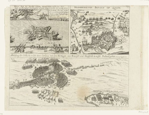This anonymous print from 1614 at the Rijksmuseum illustrates the siege and capture of Wesel by Spinola. The composition is dominated by a bird's-eye view, sharply contrasting the detailed fortification layout of the city with the open, sparsely marked surrounding landscape. Notice how the precise lines and geometric forms used to depict military positions and urban structures offer a sense of calculated strategy and order. This is juxtaposed with more organic shapes of fields and trees that suggest the natural world, almost as if to highlight a struggle between nature and human will. The stark contrast in textures, from the rough, etched lines of the fields to the intricate detailing of the city's architecture, functions not only aesthetically, but also to underline the power dynamics at play. This cartographic representation engages with contemporary debates about space, control, and the visualization of power, reflecting the era’s complex negotiations of territory and authority.