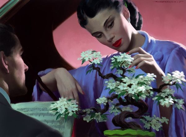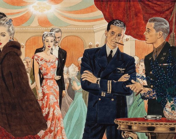Editor: This is Tom Lovell's "The Man Across the Hall," painted in 1956. It looks like gouache on some kind of board. The woman’s expression is what really grabs me—she looks surprised and a bit scared. What do you make of this domestic drama? Curator: For me, the interesting part is the evidence of the labor, literally hanging off the woman. The clothing is meticulously rendered – the textures of the wool, the cut of the suits. Lovell's labor is evident. But what is absent is the tailor’s labour, and even more importantly, the global manufacturing chains required to get the fabric and the finished product to this room. What are we meant to feel looking at these fabrics and constructions? Editor: I hadn’t thought about it that way. I was focused on the narrative—the suggestion of an illicit affair perhaps. You’re suggesting we should think about the process that produced the clothing? Curator: Exactly. Think about how mass production made items once exclusive accessible to a wider range of consumers. Suddenly, owning multiple suits, shoes, becomes achievable for middle-class people. This image stages that change but avoids dealing directly with labour as such, rather it highlights consumer anxieties and possibilities. Do you see how it captures this moment in the postwar boom? Editor: I see what you mean. The abundance of clothing underscores not just wealth but also the means of production and access. It is commenting on post-war economics and social status through the objects it depicts. Curator: Precisely. This painting is a good reminder to examine the materiality of everyday life to unpack broader societal shifts. Editor: I’ll definitely think more about the social context of materials in artwork from now on. Thanks for that insight!