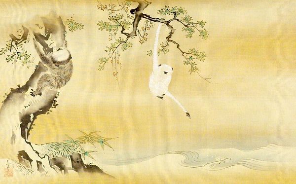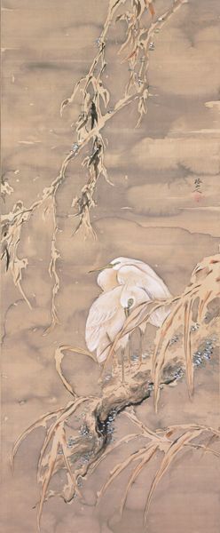 Editor: Kano Tansetsu's "Mandarin Ducks by the Water," at the Harvard Art Museums, is quite striking! The ducks are painted so delicately. What's your interpretation of this serene scene? Curator: Beyond its aesthetic charm, consider how these ducks, particularly the male's vibrant plumage, historically symbolized marital fidelity and conjugal bliss in some cultures. Is this a commentary on gender roles or expectations within relationships? Editor: So, it's not just a pretty picture; it's prompting a deeper look at societal norms? Curator: Precisely. What does it mean to idealize these relationships, especially when viewed through contemporary intersectional lenses, considering power dynamics and diverse lived experiences? It encourages critical reflection. Editor: I never thought of it that way. It's more than just ducks on a pond. Curator: Exactly! Art allows us to question, challenge, and reimagine our understanding of the world around us.