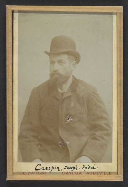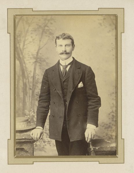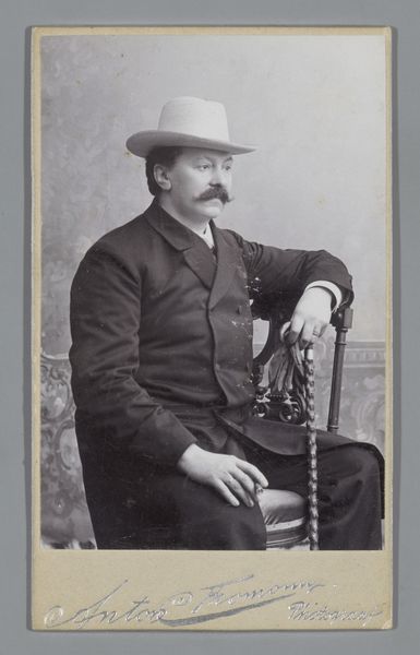 Curator: The image before us is entitled "Portret van een man met hoed", or "Portrait of a Man with a Hat", made sometime between 1860 and 1900 by Charles Chambone. It's a gelatin silver print, a fairly common process for photography during this time. What's your initial reaction to it? Editor: He seems like he would be particular about his tea. There is something about the tones here; it gives an air of gentility, like he is about to give advice. And notice how muted and simple this early photographic paper appears to be; very different from how we mass-produce things today. Curator: The gentleman's attire speaks to the social expectations placed upon men of his era. His posed nature emphasizes a desired level of class consciousness that dictated presentation. How do you see those historical labor dynamics coming to the surface in the piece itself? Editor: The man's clothing speaks volumes; that quality suit was a marker of affluence tied to industrial textile production and the labor of many. The materials present -- cloth, gelatin, silver – represent entire chains of production and consumption, spanning across different social classes and geographical boundaries. We might be looking at consumption disguised as mere elegance. Curator: Absolutely. It also hints at colonial exploitation. These raw materials were not often locally sourced. But in many ways this form of romanticized portraiture has affected the very narrative of this period. To be considered an accomplished man of a higher caliber demanded wealth which has further reaching ethical implications when you view images from this time. Editor: I agree, the seemingly straightforward portrait quickly spirals outward. The silver gelatin print shows the transition of photographic printmaking to being accessible on a larger scale than even early processes like daguerrotypes allowed. Mass reproducibility impacted not just access to media, but changed what value society placed on photographic material. Curator: Looking closely, you start to unravel narratives about identity and representation in the 19th century, reflecting hierarchies and structures, don’t you think? We have so little recorded history of women and poor populations in the same format which means they were either excluded or forced into a different bracket. Editor: Indeed, by looking at how these portraits were constructed—through photographic means and material conditions—we gain insights into class structures and commodity exchange of that period. An image like this provides more than face value upon scrutiny, revealing production’s complex socioeconomic elements, including distribution and means.
