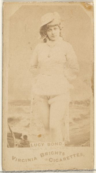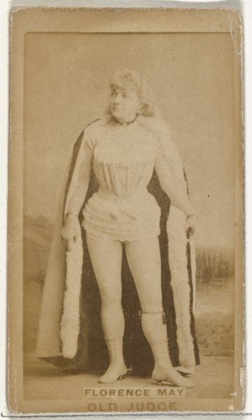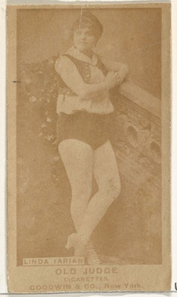 Curator: This photograph is from the late 1880s and it's part of the "Actors and Actresses" series (N171) created by Goodwin & Company to promote Old Judge Cigarettes. The photograph portrays Dora Hawthorne, an actress of the time. Editor: Immediately, I’m struck by the sepia tones—it's all creams and browns, which give it such a nostalgic, almost dreamlike feel. And that pose! It's theatrical, like she’s about to launch into some heroic speech on a windswept stage. I almost want to say "To be or not to be…" but with a modern twist. Curator: It is a promotional piece and also an object that encapsulates a crucial time in media history, one that saw a shift towards marketing with images and celebrity endorsement. We could also read Dora Hawthorne's pose and presentation through the lens of female performers and expectations in that period, looking at representation, agency, and the gaze. Editor: Exactly! Think of what was being *sold* alongside the cigarettes—fame, aspiration, maybe even a little rebellion, all rolled into this tiny card. What really gets me, though, is trying to imagine Dora herself. What was she thinking, feeling, when she struck this pose for what was essentially an advertisement? What was her experience navigating the world of theater and media at that time? Curator: Contextualizing her representation within evolving definitions of labor, femininity, and stardom can broaden our perception beyond a mere product endorsement. We might examine questions around the ownership of images, the role of publicity, and the intersections with burgeoning mass culture and female performance. Editor: It does make you wonder who *owns* their image, then and now, which I suppose is always relevant, particularly for a woman in performance. But ultimately, beyond its historical context, the image to me is evocative and quietly haunting, and I am reminded of some fading photograph tucked away in an attic that whispers stories from another era. Curator: It’s the blending of these personal and historical dimensions that grants this photograph, and indeed many objects like it, enduring meaning, encouraging us to reflect upon how we are still engaged with images and promotion within systems of power that, sadly, often haven't changed that much. Editor: Precisely. It's a sepia-toned time capsule inviting us to contemplate past performances and consider the echoes they find in today's cultural landscape.