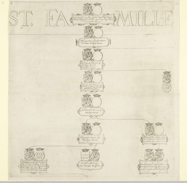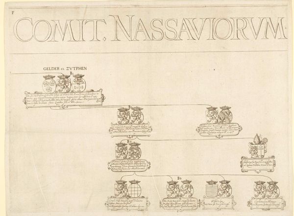 This is an engraving, titled 'Stamboom van het Huis Nassau, blad G', or 'Family Tree of the House of Nassau, sheet G', made by an anonymous artist. It is dominated by heraldic symbols, each a microcosm of familial history and aspiration. Notice the recurring lion motif, a symbol of courage and nobility, traceable back to ancient Mesopotamian iconography, where lions guarded temples. Here, it signifies the power and prestige of the Nassau lineage. Consider the wheel, another prevalent emblem, echoing the cyclical nature of fortune. In some contexts, the wheel represents divine power, but here, it seems to speak to the ever-turning wheel of fate, a reminder of the rise and fall of dynasties. The collective memory embedded in these symbols resonates deeply, triggering associations with power, heritage, and the passage of time. These emblems, repeated and varied, are not mere decorations; they are potent carriers of cultural memory, surfacing from the depths of our shared consciousness. They speak to the profound human desire for legacy and the enduring quest to immortalize one's name in the annals of history.