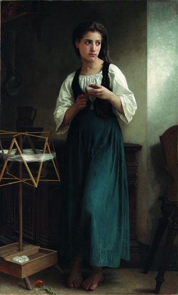Curator: This is Paulus Bor's "Cydippe with the Apple of Acontius," created around 1645-1655. Editor: It’s surprisingly subdued for a Baroque painting, isn't it? The somber tones and contemplative mood give it an unusual intimacy. The drape of her robe almost looks tactile, you can tell the painter invested effort into making that fold drape with depth and body. Curator: Indeed. Bor was known for his unique interpretations of classical subjects. Cydippe here is part of a Greek love story. She was tricked into marrying Acontius after unknowingly vowing to marry him by picking up an apple he inscribed with that promise and leaving in her path during a religious festival. Editor: So, the apple becomes a material symbol of trickery and forced consent? It's an everyday object imbued with consequence. How was this piece commissioned or marketed during this period, and who was its original owner, do we know? Curator: That part of the painting’s social life is still somewhat unknown. Bor worked outside the mainstream of the Dutch Golden Age, and this painting has themes relevant to gender studies: Cydippe is seemingly devoid of agency, a reflection on societal constraints on women. It seems, to me, as a potent metaphor of female subordination couched within classical storytelling. Editor: The crafting of her clothing seems intentional. It is interesting how Bor frames her garments almost against her, she doesn't necessarily adorn them, they adorn her, presenting her within certain limitations as dictated by gender. Curator: Right. And her gaze is also key; she is pensively contemplating this instrument that dictates her future. You can tell Bor's mastery of form is quite progressive because this moment captures the complexity of love, obligation, and autonomy. Editor: Looking at the paint application, it's so smooth. Almost like enamel work to reflect certain surfaces that also creates shadows that accentuate that somber tone we noticed before. One has to appreciate the hours of labor dedicated to layering these materials and making choices that elicit feelings for the viewer. Curator: Exactly. Bor prompts us to consider enduring power dynamics throughout history, even in how these mythologies permeate the reality for so many in that period. Editor: Ultimately, the deceptive qualities of material production mirrors the events of its narrative, and what it all represents is ripe for debate even today. Curator: Very true. It certainly provides a rich point of conversation!