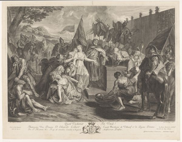 Curator: Before us is an engraving titled "Karel II van Engeland arriveert op het strand bij Dover, 25 mei 1660" by William Woollett, dating back to 1789. It's quite a scene! Editor: Indeed! My immediate impression is one of calculated theatricality. The figures are arranged almost like a stage tableau, everything meticulously composed for maximum impact. There's an almost oppressive feeling of order here. Curator: Absolutely. The engraving reproduces Benjamin West’s painting depicting Charles II's arrival in Dover marking the restoration of the monarchy. Considering that prints like this were widely disseminated, it's interesting to examine them not just as art, but as cultural products shaping popular perceptions of power and historical events. The materiality of the print itself speaks to its function in distributing royalist ideology. Editor: Precisely! Look at how Woollett, the engraver, uses light and shadow to create depth and drama. Notice the textures rendered with such precision, the fabrics, the faces... and consider how each line serves the whole to create a certain air of grandeur. Even the very choice of gray, rather than sharp contrasting blacks, is very thoughtful, it provides for harmony in the depiction. Curator: I am very interested in how engravings democratized access to history painting. Suddenly, these grand narratives were available to a much wider audience. But the image also invites consideration about labour, for instance, and it shows the work behind reproducing art for mass consumption. How was the division of labor organized, who profited most, and what kind of artisanal traditions were at play here? Editor: Interesting. I keep coming back to that central group—Charles and the kneeling figure. The gesture, the clothing, and even the implied narrative is building an archetypal hero. The formal construction encourages the viewer to find the composition almost perfectly framed with the high tower overseeing a calmful composition. Curator: Examining this print helps us remember art’s relationship to politics, production and distribution. I am pleased by seeing it through this materialist lens that uncovers more about the circumstances in which visual narratives take on their meaning. Editor: And I found value analyzing its structure and form to comprehend its timeless pursuit of grandeur and meaning through meticulous compositions, a potent way to get closer to historical artistic strategies.