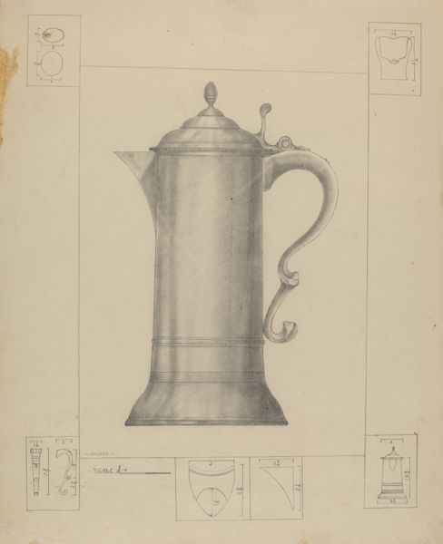 This piece is Aaron Fastovsky's rendering of a Sacramental Ewer, made using graphite and ink wash on paper. The artist has taken a mechanical approach to art making that feels almost like an engineer's schematic. Look closely, and you can see the gentle gradations of tone achieved through ink wash, giving the vessel a lustrous, almost metallic sheen. It’s as though Fastovsky is feeling his way around the form, describing its curves and angles with meticulous precision. The linear quality of the graphite reminds me of Old Master drawings, where every line counts. The whole composition seems to be more than just a study; it’s a meditation on form, function, and the enduring allure of utilitarian objects. Fastovsky's approach to form and perspective are quite similar to those employed by Albrecht Dürer. This creates a visual dialogue that spans centuries, reminding us that art is indeed an ongoing conversation.