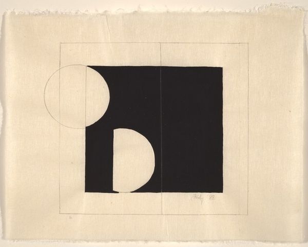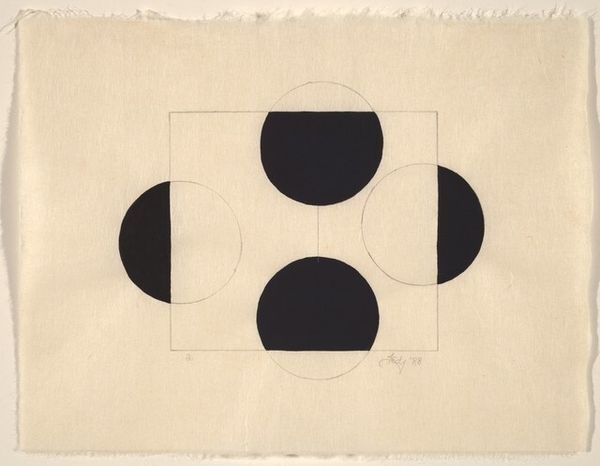 Ann Ledy created this untitled work from graphite and ink on paper. It is a quiet piece made in 1988. Born in 1952, Ledy came of age during the feminist art movement, and her work speaks to a generation of women artists who sought to redefine traditional artistic practices. What does it mean to make abstract geometric forms after minimalism has had its say? Ledy seems to be asking. The overlapping circles, bisected by a strong vertical line, create a sense of tension between order and fluidity. The stark contrast between the precise graphite lines and the solid black ink evokes both a sense of harmony and discord. The raw edges of the paper add a tactile, almost vulnerable quality to the work. The contrast invites us to consider the delicate balance between intention and chance, control and surrender. It's a quiet but powerful reflection on form, space, and the act of creation itself.