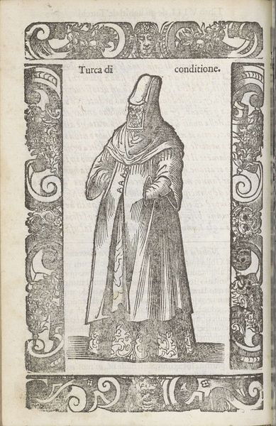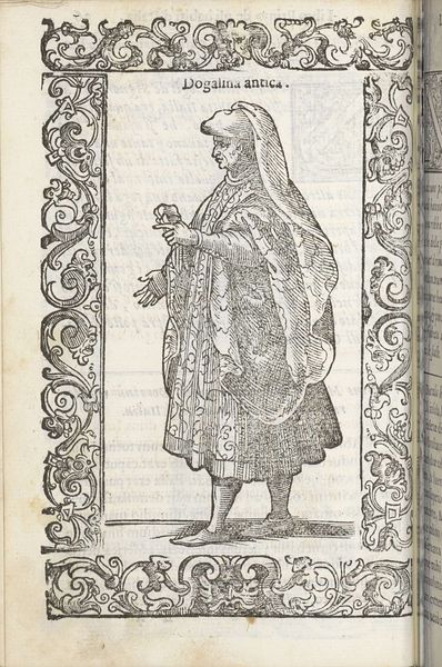 Editor: Here we have Christoph Krieger’s “Donna di Alfatia,” created in 1598. It seems to be an ink drawing, perhaps even an engraving. The details in the clothing and the elaborate frame are really captivating. What strikes me is the way the lines delineate texture and status; what can you tell me about that? Curator: The materiality here is critical. Look at the production of this image; it's an engraving. What does that mean in 1598? It's about dissemination, about the accessibility of images. How does this image operate within the book it inhabits? Is this "high art" or something else? Consider the labor involved, the purpose. It serves a function as reproducible information. Editor: So you’re suggesting it’s not about individual expression, but mass communication? Curator: Precisely! And communication of what? The detailed clothing isn't just decorative. It speaks to trade routes, access to materials, and even cultural appropriation or influence. Where did the textile designs originate? Who benefited from their production and distribution? Editor: I see… it's a snapshot of global exchange as reflected in this woman's garments, meticulously captured through the engraving process for wider circulation. It speaks to the intersection of artistic skill, production technologies, and socioeconomic systems of the time. Are you also saying that art helps people understand trade and material culture? Curator: Indeed! It shows the complex exchange of materials in 16th century Europe. It is vital to connect labor and commerce to the cultural expression found in drawings like this. Editor: I’ve always thought of art as purely aesthetic, but it’s clearly interwoven with industry and society. Curator: Exactly! It has opened my eyes to the integration of the materiality and socio-historical dimensions of the art-making processes.