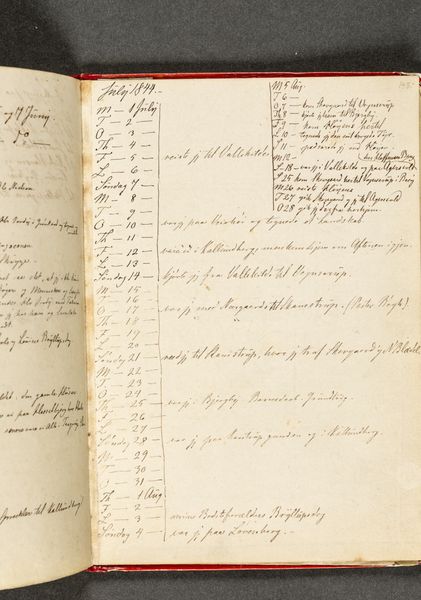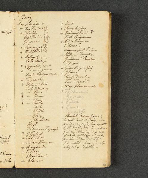 Curator: Today we’re looking at "Sager som ere Husvilde endnu. 7 april 45", which roughly translates to “Things That Are Still Homeless. April 7, 1845." This drawing on paper, created with ink, is by Johan Thomas Lundbye. It's currently housed at the SMK, the National Gallery of Denmark. Editor: My first impression? It feels…almost bureaucratic. Not in a bad way, but the handwriting gives the sense of record-keeping or a personal inventory. Curator: That’s perceptive. Lundbye, associated with Romanticism, created this during a turbulent period. Consider the socio-political climate: Denmark was grappling with national identity, facing pressures from rising German nationalism and internal conflicts over governance. Editor: And those details feed into the materiality. Ink and paper were readily available means, allowing for intimate, almost secretive, acts of documentation. What strikes me is the sheer accumulation of names – the "Løvings Portrait" and "Skorgaards Portrait" sections feel very deliberate. Were these commissions? Did it turn into an itemized accounting of sitters for various projects? Curator: Precisely. These aren't just names, but social connections, networks of patronage, potential patrons and his musings – all integral to an artist attempting to make a career within specific societal structures and power dynamics. Notice how neatly they are recorded, it’s as if each is a commodity. Editor: Right, there's labor and potential material gain embedded into this little sketch. But, too, you get the other items noted-- "theater," "six chairs," seemingly mundane entries mixed among these portraits, all lending a texture to the narrative. The phrase from the title continues to haunt my reading. Curator: That phrase gets at the heart of it – "Things That Are Still Homeless." We can view this not only in terms of tangible dispossession or displacement but also the intangible realms of ideas and identities in flux, perhaps reflecting his anxiety about national identity? Or even art making’s place? Lundbye captures, in miniature, this tension and uncertainty through this very personal work. Editor: For me, the charm is in that raw process, exposing labor and production within an artwork of memory and feeling, something vital in our discussions about art’s purpose today. Curator: Agreed, the small scale and intimate quality forces us to reflect upon bigger things about society, gender and place that speaks volumes about its purpose.