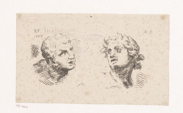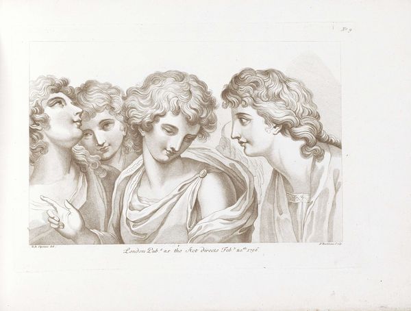 Curator: Let's delve into this captivating pencil drawing by Karl Palzow, titled "Mannen en jonge vrouw," created around 1830. The piece is rendered in delicate strokes of pencil. Editor: Mmm, yes...my initial thought is stillness. A sense of poised expectation, almost. It's as if they're holding their breath waiting for a secret to be revealed. Curator: It’s fascinating to consider this in the context of its time, just prior to the 1848 revolutions that shook Europe. This drawing is an artifact of the Romantic period and it also offers insight into genre painting through its focus on representing everyday life, however idealized. We need to think critically about who gets included, and in what way, when discussing 19th century art. The placement of a young woman, seemingly a mere muse, juxtaposed against the clear gaze of the two men behind is problematic. Editor: Absolutely, yes! I pick that up. She’s almost ethereal compared to them, a wisp of fancy floating into their serious, weighty world. The flower she holds adds to that, like she's offering them a moment of transient beauty in contrast to their rather stoic solidity. Perhaps offering some distraction. I mean... aren't we all looking for that, really? Curator: This representation absolutely invokes considerations regarding the expected roles of women and the societal constraints that shaped their visibility. While seemingly charming, the tableau encapsulates the unequal power dynamics present in social life at that time. Is the woman's role simply to hold the flower and represent youth? Editor: Yes, well, isn't that how these works often feel – heavy with questions about how we were *supposed* to be? Even the muted tones of the pencil contribute. A sense of fading expectations or maybe unspoken things… that feeling. I get that! And there's such fragility! You want to dive into it and see everything, know all the details! I bet it was quite an emotional statement then! Curator: Right. Looking at this again, this is such a pertinent artwork that triggers considerations of representation and how historical social contexts can affect one's engagement with artworks, even today. It is such an exercise in trying to dismantle stereotypes. Editor: Exactly, right? So, next time, shall we seek out works about resistance *against* those restrictive portrayals? Works bursting with bold new identities…!