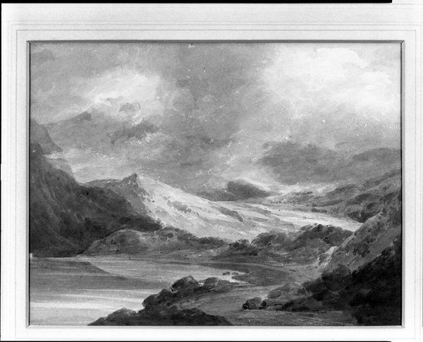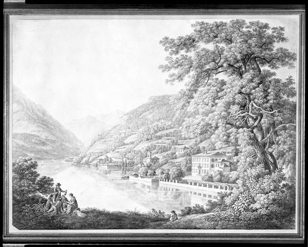 Editor: Right now, we’re standing in front of "View of the Rhine" created sometime between 1624 and 1685 by Herman Saftleven. Looking at the play of light and shadow in this painting, I immediately get a sense of peaceful grandeur. What jumps out at you when you look at this, Professor? Curator: Well, this isn't your typical brightly colored landscape, is it? It's moody, introspective. I’m captivated by its tonal range. Saftleven manages to evoke a sense of depth and atmosphere using such a limited palette. It makes me think about memory – how we often recall landscapes not as vibrant Kodachrome moments, but as faded, cherished mental snapshots. Don't you find that a bit melancholic, like a bittersweet farewell? Editor: Definitely. The monochrome makes it feel more… historical. How do you think the limitations of the color palette at the time would impact artists of that era? Curator: Precisely, but also consider whether it was the "limitations", or perhaps it was a deliberate artistic choice to enhance that evocative quality we were just discussing. What would the scene convey to you in full color? Editor: That’s interesting – I guess it might look too idyllic? So it evokes something else, maybe a more tangible connection to the past because it isn’t idealized? Curator: Yes, it could flatten the landscape, removing some of the ethereal mood and transforming our sepia-toned memory back into vibrant hyperreality. So it all leads me to think about perspective and choices: the artists', and our own. I wonder, how will *you* choose to remember this experience, viewing this painting today? Editor: That's a powerful question to consider as we leave this work! Thanks so much. Curator: A pleasure, as always.