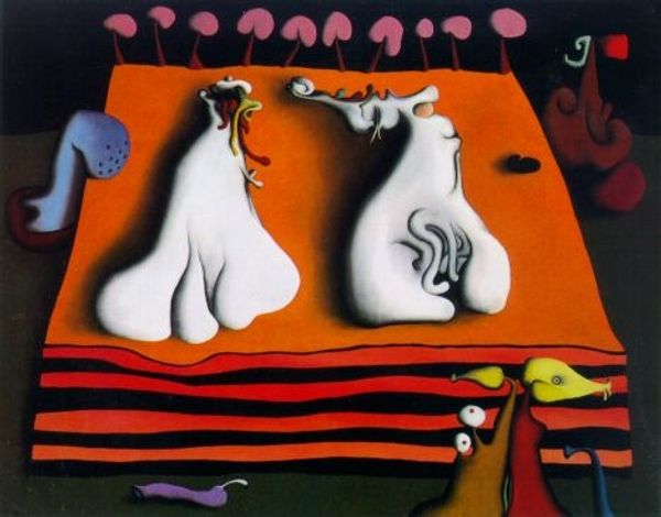 Curator: Welcome. Before us is “The Titillator,” an oil painting created in 1972 by Desmond Morris. Editor: My initial impression is pure, unsettling whimsy. These biomorphic shapes feel almost… internal, like organs escaped from their rightful place. Curator: It is classic Morris, pushing Surrealism into zones of unsettling figuration. He often explored primal urges and subconscious anxieties through such imagery. I see a distinct use of rounded, organic forms and protrusions. How do you perceive that visually? Editor: There's definitely an emphasis on smooth surfaces and a kind of cartoonish hyper-realism. You can almost feel the texture even though it's just oil paint. What’s interesting to me is this implied sense of tension. Everything appears to be straining or about to burst. And it begs the question, who made these pigments? What level of skill went into their mixing and application? Was Morris critiquing commodity fetishism via the use of high-quality paints? Curator: That feeling of tension may be intrinsic to his symbolic language. The configurations imply probing and prodding. Remember Morris’s background in zoology: consider what those gestures and shapes might evoke from an anthropological view. What does "titillation" symbolize here, from cultural and psychological angles? Editor: Possibly some kind of aggressive probing of the modern condition? This almost tactile quality makes the painting feel visceral despite its bizarre imagery. Curator: The colour scheme is rather interesting: ochres, muted purples and a bright almost aggressive crimson red; creating a sense of underlying anxiety. It would be revealing to find if Morris deliberately employed artistic techniques common within this style to make viewers contemplate primal ideas. Editor: Agreed! Well, thinking about production, there is the artist, yes, but there’s also the system enabling production. That context really shapes meaning here, right? Curator: Indeed. “The Titillator," whether stimulating or unsettling, speaks to enduring questions about the nature of existence through its evocative and unusual visual language. Editor: An oddly compelling peek into the biological weirdness around, and within us.