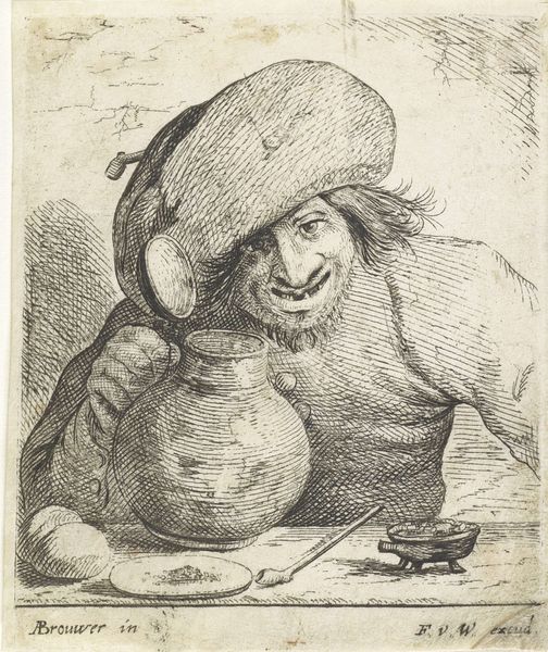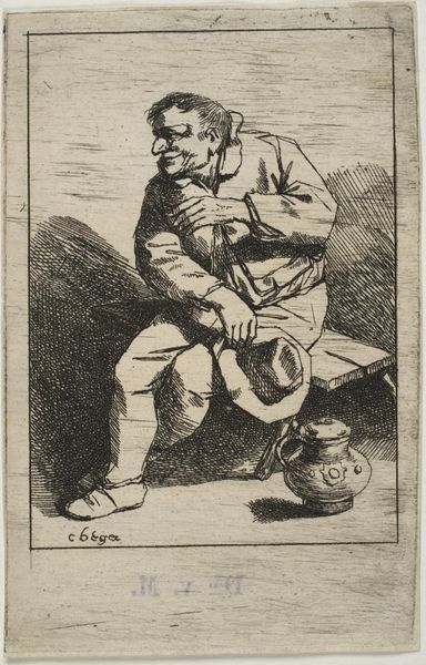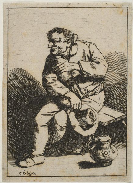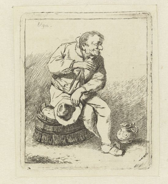 This etching, made by Jan Matham in the 17th century, is all about line. Look closely and you'll see that the image is built up from a dense network of etched marks, a painstaking process of dragging a fine needle across a metal plate. The material result is a scene of everyday life, rough and ready. We see a farmer puffing away on a pipe, surrounded by the simple stuff of his existence: jugs, barrels, and even a few cats. The very act of etching, with its demand for meticulous labor, stands in contrast to the farmer’s more relaxed attitude. That's the social tension here: the image immortalizes a life of humble toil, but it does so using a process that's far removed from the farm. Matham's etching elevates the ordinary, but it also reminds us of the distance between the artist and his subject, between the work of art and the work of everyday life. In the end, it asks us to consider the value—and the values—embedded in both.