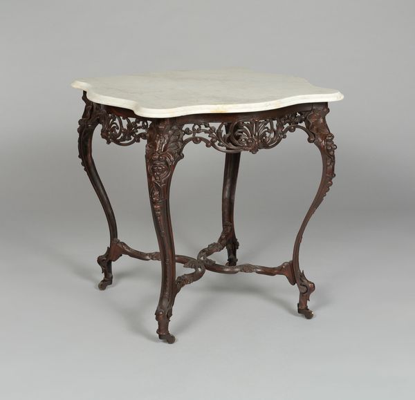 Editor: This is the “China table” crafted around 1750-1760, attributed to Thomas Chippendale Junior, currently held at the Metropolitan Museum of Art. The dark wood and intricate carvings give it such a rich feel. What draws your eye to this piece? Curator: The 'China table’ speaks volumes about the cultural dialogue happening in the 18th century. It is less a functional item and more of a cultural artifact; a status symbol that whispers tales of global trade, exoticism, and social aspiration. Notice how it visually embodies Chinoiserie – a European interpretation of Chinese motifs. The table becomes a stage for displaying coveted Chinese ceramics, symbols of wealth and taste. Editor: So the form itself communicates meaning, not just the objects it holds? Curator: Exactly. Consider how the delicate fretwork edging and the cabriole legs ending in claw-and-ball feet merge European craftsmanship with an imagined Orient. These details tap into cultural memory. Each curve and flourish attempts to visually capture the allure of the East. Do you think it authentically represents Chinese culture? Editor: Not really, it seems more like a fantasy version. It says more about Europe's fascination than actual Chinese artistry. Curator: Precisely. And that’s its power. It embodies that specific historical moment of cross-cultural fascination, how one culture interprets, and often, misinterprets, another. The object becomes less about China, and more about the European desire *for* China. Editor: That's a fascinating perspective; I hadn't considered the element of desire so directly shaping the object itself. Curator: Seeing furniture as a carrier of cultural longing truly enriches our experience of design, wouldn't you agree? Editor: Definitely, I'll never look at decorative art quite the same way again. Thanks!