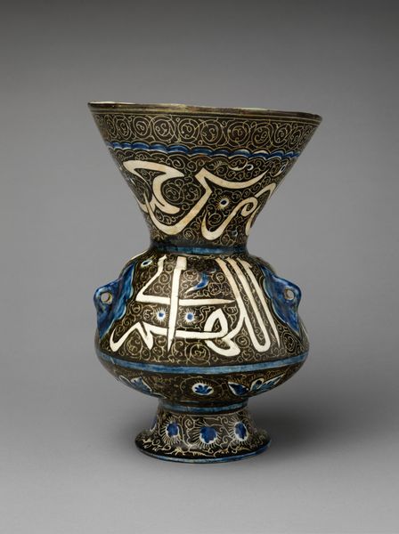 Curator: The work before us, presently residing here at the Minneapolis Institute of Art, is a ceramic earthenware piece by Joseph-Théodore Deck, entitled "Vase in the form of a mosque lamp," created around 1870. What strikes you initially about this object? Editor: Well, aside from the fact it feels a bit paradoxical—a vase imitating a lamp—the most striking feature is its rich ornamentation. A blend of blues and greens set against that crisp white calligraphy. It feels quite opulent, almost ostentatious. Curator: I agree. The color palette carries certain cultural weight. The turquoise specifically, appearing repeatedly, holds great symbolic importance in Islamic art—often linked to notions of paradise and purity. This shade, combined with the stylized calligraphy, transports the viewer. Editor: Yes, and considering Deck's broader artistic context, it’s fascinating to see how he absorbed and reinterpreted Islamic motifs, given that he wasn’t part of that cultural milieu himself. The mosque lamp, traditionally holding profound spiritual significance within Islamic architecture, takes on a new identity here—transformed into a decorative vessel for a European audience. What do you make of that translation? Curator: It reflects the 19th-century Orientalist fascination with the ‘exotic’ East. While some view Orientalism critically as a projection and distortion, it also fostered an exchange of artistic ideas, seen in Deck’s emulation and adaptation. The inclusion of this imagery created a potent symbolic association with spirituality. Do you consider that valid? Editor: Valid, but within limits. The decorative aspect almost overshadows any deeper understanding. The object flattens complex cultural realities into pleasing aesthetics, which risks losing its original meaning. Yet, one might also argue that Deck's adaptation made Islamic art more accessible, even fashionable. What remains crucial is understanding that translation comes with a heavy dose of interpretation and historical context. Curator: Ultimately, the object speaks volumes, sparking discussion around cross-cultural influence, artistic license, and how societies assign new significances to imagery across different eras and geographic contexts. Editor: Indeed. This vase stands as a reminder of how cultural symbols evolve and the nuanced ways art both reflects and shapes historical perceptions.