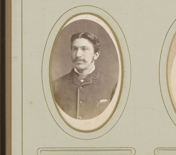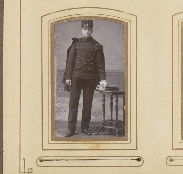 Curator: Here we have a captivating 19th-century portrait. It is titled "Portret van een jonge man in uniform," or "Portrait of a Young Man in Uniform." The photograph is credited to Leon A. van Weijderveldt, and likely dates between 1868 and 1888. Editor: The photograph is surprisingly evocative; his somewhat stern expression and the rigidity of his posture seem weighed down by duty. Curator: Precisely. The very presence of the uniform carries profound weight, acting as a visible marker of the individual's alignment with broader institutional powers, the military complex of that historical time. Note how he interacts with the sword; that's a prop charged with meaning. Editor: That hilt is subtly directing our gaze, the blade pointing down but ready. I imagine many young men wore this uniform and felt they were more than ready to become heroes, defenders. It's such a pervasive and deeply ingrained cultural trope, still lingering today. Curator: Yes, and how was military service perceived during this period? For many, it was seen as a duty, a pathway towards societal integration, particularly in regions grappling with burgeoning nationalistic fervor. His stiff posture isn't just a result of photographic limitations of the time. It speaks to an internalisation of that perceived duty. Editor: Yet, there's a quiet defiance in his eyes, maybe uncertainty, something deeper than blind obedience. I get a feeling he is both part of the system and also apart from it. It is hard to reconcile youth with warfare even today. Curator: And photography itself during that time was far from objective. These images reinforced power structures. Notice how it mimics formal painted portraiture – a deliberate construction aimed at elevating the subject. It's important to acknowledge the ways that photography participates in those larger social and political dynamics. Editor: Absolutely. These photographs offered permanence at a price – one that fixed ideas and idealized realities. This image preserves a powerful tension. Curator: Thank you, your interpretation enriched our understanding, revealing these nuanced elements woven within the image's visual tapestry. Editor: My pleasure. It is the lasting power of a portrait to let us access the past in such an intimate manner.