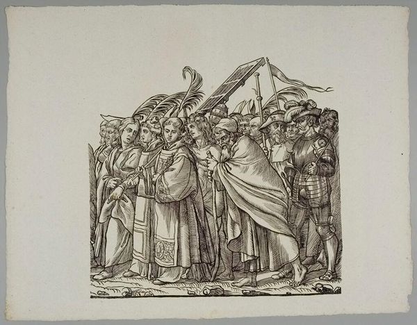 Editor: Here we have Willem Frederik Vinkenbos' relief sculpture, "Scene from the Eighty Years' War," dating from around 1879 to 1890. The subdued color really highlights the texture, creating an almost dreamlike feel. What's your read on this? Curator: The muted tones absolutely contribute to its evocative power. Reliefs, especially historical ones, become loaded with symbolism. Notice the figure haranguing the crowd, literally elevated. Doesn't that position, combined with their raised arms, remind you of the power dynamics inherent in iconography across cultures? Consider too, the figures to the left—their postures telegraph distress, supplication, fear. How do they compare with the stances of those on the right, who seem almost indifferent? Editor: I hadn’t considered the difference in body language that deeply. It does look like there are stark contrasts, like a division of social classes depicted, perhaps, as well as differences in belief? Curator: Precisely! Consider this through the lens of cultural memory. What visual cues does Vinkenbos use to trigger associations with power, authority, or conversely, oppression and resistance in the viewer's mind? Even the choice of clothing serves as a marker of allegiance. Those aren’t just costumes, are they? Editor: I see what you mean. It’s like each element works together to construct a narrative about this historical moment. And it still carries that emotional resonance. Curator: Yes, this becomes more than just documentation. Vinkenbos taps into deeper anxieties about social order, authority, and historical conflict. What will be remembered of this particular scene? What emotional charge does it carry? The piece almost vibrates with unextinguished passions from centuries past. Editor: I’ll never look at a historical relief the same way again! Curator: Excellent. Symbols, as cultural echoes, shape how we perceive the present through the reverberations of the past.