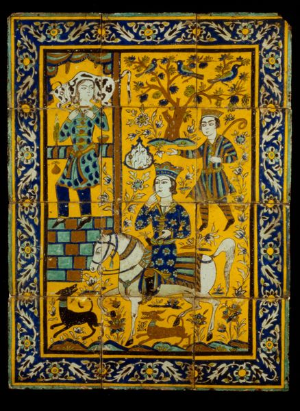 Curator: Look closely at this exquisite textile painting titled "The Celebration of Siavoosh and Soodabeh", believed to be crafted by Mirza Agha Emami. Its a testament to the rich tradition of narrative art, especially miniatures within Islamic art. Editor: It’s strikingly intricate. The colours, even on textile, are vibrant, and the bordering illustrations are such an eye catching element that give depth to the main topic! There’s an overwhelming sense of detail but it's a story seemingly frozen in a moment of intense emotion. Curator: Precisely. What’s especially interesting from a historical perspective is how this artwork embodies cross-cultural interaction, it brings to light the socio-political contexts of Persian courtly life. How the ruling authority sponsored works celebrating themes of courtly love. Editor: Indeed, courtly life appears to be the ideal place to talk about relationships between powerful men and vulnerable women. Examining such narratives opens important questions about power structures in Islamic art. The story itself likely explores identity, gender and class issues too. What's your sense of the leading characters' agency here? Curator: I view it as reflective of its time; societal expectations and gender roles were rigid. However, these art pieces also provided some form of subtle, acceptable challenge of societal rules, through complex romantic dramas. The art itself served as a site of negotiation for the ruling authorities, for the viewers, as well as for those crafting it. Editor: I suppose, on a closer look, it shows the complexities inherent in art from historical periods that at face value appears conventional and idealistic. I think art acts as a mirror, a reminder of how much has changed, or perhaps how much remains the same regarding social hierarchies. Curator: Exactly. And even more crucially, a prompt that art and the circumstances around its creation offer insight to better navigate those questions. Editor: Agreed, viewing the past gives ways to discuss urgent socio-political issues and art from history serves to examine today.
