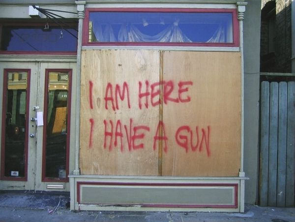 Curator: This photograph by Richard Misrach is believed to have been taken between 2005 and 2010, likely around New Orleans and the Gulf Coast after Hurricane Katrina. He’s known for his large-scale color photographs, often depicting the relationship between humans and their environment. What strikes you first about this piece? Editor: It’s brutal. Raw. Immediate. The scrawled red text against the boarded-up storefront… it’s a stark announcement of fear and desperation. "Looters will be shot." Chilling. Makes you wonder about who wrote it, and under what circumstances. Curator: Exactly. The image’s power lies in its directness. Misrach often photographed landscapes altered by industry, disaster, or human intervention. Here, he captures the socio-political climate post-Katrina—the breakdown of order and the anxiety surrounding security and survival. The threat isn't just implied; it's explicitly stated on what looks like scavenged wood. Editor: And it's a complete visual metaphor, isn’t it? The wood represents protection, yet also fear. The crude lettering shows how easily civilization can crumble, leaving us exposed, raw, and afraid. Curator: Absolutely. Consider the wider context. Katrina exposed systemic inequalities, governmental failures, and the vulnerability of marginalized communities. This image is evidence of these societal fractures. Editor: You know, I can almost smell the dampness in the air looking at it, see the rot and decay, but also feel the underlying anger bubbling just below the surface. The photo, on first glance, looks unassuming, but really digs beneath the skin. Curator: Yes, the boarded-up building becomes a symbol of a city wounded, trying to protect itself, but perhaps resorting to a form of vigilante justice in the process. The photo demands that we confront uncomfortable questions about human nature and societal responsibility during a crisis. Editor: I see echoes in other current crisis points throughout the world. Sadly this isn't an image confined to history; it keeps showing up. We’re constantly trying to protect ourselves in very unsafe and volatile spaces. Curator: A stark reminder of the ever-present tensions that shape our world and the role that photographic art plays in documenting them. Editor: Makes you want to ask harder questions and challenge the easy answers, that's for sure.