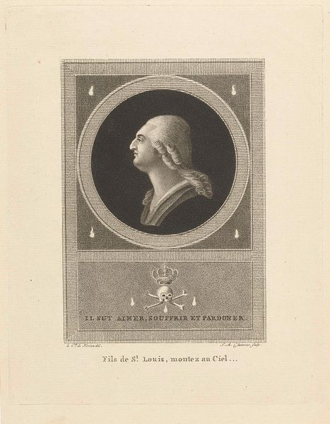 Editor: We're looking at Girolamo Carattoni's "Portret van musicus Betti", an engraving, dating anywhere between 1767 and 1809. It has an interesting composition. The portrait is framed, as is a bas-relief sculpture underneath it. The precision and clean lines are quite striking. What do you notice, considering its visual structure? Curator: The oval portrait, placed above a rectangular scene, immediately establishes a hierarchy of forms, wouldn't you agree? Note the sharp delineation, almost geometric, throughout the work. Observe how the texture created by the engraving technique contributes to the clear definition of forms. Editor: Yes, the sharp delineation is what really makes it, and the gray tones help bring it to life. Can we say anything more about the geometry of this work? Curator: Geometry serves as the foundational principle, the regulating device for our perception. The arrangement isn’t random, of course. Examine the echoing rectangles that encase each element; consider the effect the repeating shapes might suggest about the period in which this print was made. Editor: So it’s the relationship between the lines, shapes, and tonal values that constructs meaning? And by looking at these inherent qualities, can one place this art within the Neoclassical movement? Curator: Precisely. Note the absence of emotional flourish; the emphasis on symmetry; the focus on clear, rational form. By concentrating on the internal organization, we understand how the image functions as an aesthetic object and also as a signifier of particular cultural values. Editor: I see it now. Thanks for showing me how to read an image purely from its structure and composition! Curator: It has been a pleasure; analyzing how line, shape and form come together, provides profound insight.