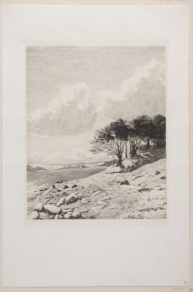 Curator: Looking at this watercolor landscape, I'm immediately drawn to the monochromatic grays and the light-infused clouds—a quiet sort of majesty. Editor: Indeed. What we have here is Willem Wenckebach's "Rocky Bay," dating from before 1894. It’s currently part of the Rijksmuseum collection. We see an impressive articulation of texture and atmospheric perspective. Curator: I agree; notice how Wenckebach utilizes the aged, toned paper to subtly amplify the overall mood of this work. There's a remarkable simplicity in the composition, a near abstraction. How do you perceive this choice influencing our reading of the landscape? Editor: Knowing Wenckebach’s social circles, his likely audiences were accustomed to grand, Romantic landscape paintings laden with explicit political or nationalistic themes. His scaling-down—both literally in terms of the sketch's size, but also metaphorically—can be read as an act of artistic rebellion, embracing intimacy. Curator: Interesting, an early intimate realism. For me, it evokes more personal reflections, through these shapes. Observe how the strategic deployment of light not only defines the forms but also suggests a kind of internal meditation. The play between the solid, textured rocks in the foreground and the softly rendered sky. Editor: That perspective is interesting considering the historical debates around landscape art during that period. Is the "landscape" an ideal location, or just rocks, sea and some seabirds like these, with no need for national or historic symbolism? Curator: It does make one pause and contemplate the function of pictorial elements in landscape art, then, and now. By de-emphasizing the literal or grandiose, is Wenckebach inviting viewers into a more nuanced relationship with space? Editor: This invites considering landscape’s role in the construction of social and national identity at the turn of the century. Wenckebach seems less invested in promoting a particular narrative or ideology tied to the landscape. Curator: A stripping-down, allowing for different interpretations. Well, seeing it as an opening rather than a closure— that adds another dimension for future interpretations. Editor: Yes, that’s what I find powerful. A small, relatively humble watercolor prompts a reevaluation of what we expect of landscape.