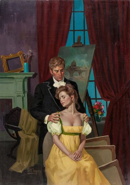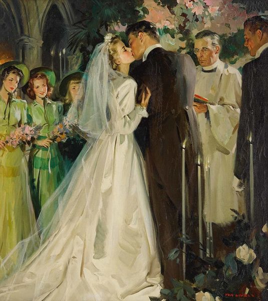 Tom Lovell’s ‘Up The Staircase’, made in 1942, is all about soft edges and dreamy light. Lovell's got this way of blending colors that feels almost like watercolor, even though it's probably oil. Look at the way the light hits the woman’s dress – it’s like he’s trying to capture the feeling of the moment, not just the look of it. The color palette is limited, but warm. The black tuxedo really pops. The brushwork is loose, but precise, especially in the faces. Now, check out the hand. The way it grips the dress, is so interesting. It's not about perfection, it's about the gesture. It reminds me a bit of some of Degas’ paintings, actually. Art’s like this ongoing conversation, right? Lovell’s work makes me think about how different generations of artists keep riffing off each other. It's about how we keep remixing and reinterpreting the past in our own way.
