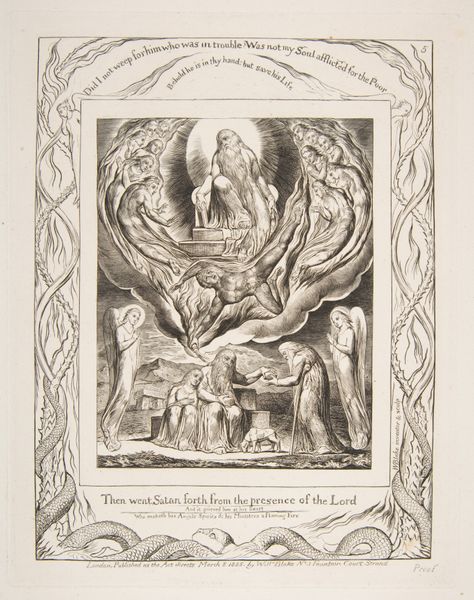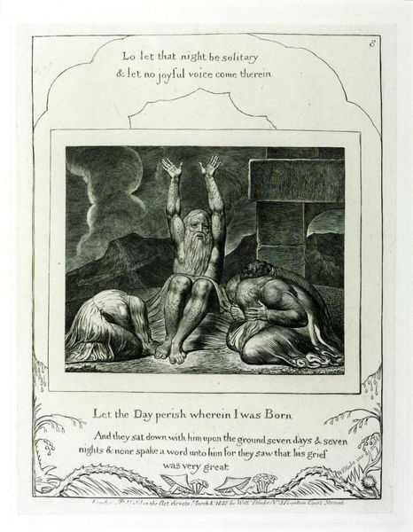 Curator: This is William Blake’s "Job Rebuked by his Friends," one of his Illustrations of the Book of Job. It dates to 1825 and is currently held in the Tate collection. Editor: There's a palpable sense of accusation here. The somber figures seem weighted down, even as they point fingers at Job. Curator: The materiality of Blake's prints is fascinating; he combines etching and engraving, layering meaning through the very act of production. The text interwoven with the imagery speaks to the social and spiritual context. Editor: Blake was deeply invested in the role of art as prophecy and social commentary. How do you think the public at the time received such stark imagery? Curator: Blake challenged artistic conventions, using his craft to question authority. His art encouraged viewers to resist dogma and injustice, issues as relevant then as they are now. Editor: His work continues to provoke and challenge us to consider our roles in the face of suffering.