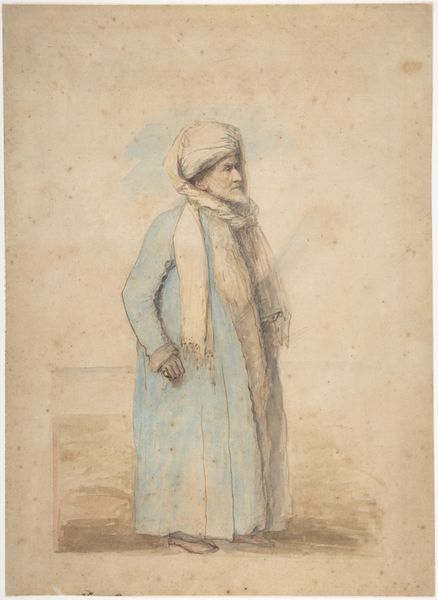 Editor: Here we have John Frederick Lewis’s watercolour, “Sheik Hussein Of Gebel Tor And His Son.” There's an almost photographic quality to the realism of the figures, and I am struck by the contrast between the detail in their faces and clothing and the vagueness of the background. What stands out to you? Curator: The cultural memory embedded in this image is quite rich. Lewis was a key figure in the Orientalist movement. Note the deliberate detail he lavishes on their attire and weaponry; those details speak of status and power. Consider the scimitar – not merely a weapon, but a symbol of leadership and authority. The father’s firm gaze speaks to the weight of responsibility, echoed but softened in the son’s averted gaze. Do you notice how their postures tell a story? Editor: Yes, now that you point it out, it’s clear the father is presented as stoic and authoritative, while the son is almost…apprehensive? Is this perhaps a commentary on tradition and inheritance? Curator: Precisely! The imagery implies not just a bloodline, but a lineage of duty. The sheik’s turban, the cut of his robe – all are deliberate visual cues that construct an image of nobility. It evokes a very specific narrative. What assumptions does that visual language ask the viewer to make? Editor: That's a very useful way to frame it. I was initially caught up in the visual accuracy of the depiction, but I can now recognize how the symbolism tells its own distinct story. Curator: Exactly. Recognizing those symbolic gestures within the work enables us to access the depth of cultural meaning the artist has invoked. Editor: Thank you, I'll be sure to examine how artworks speak through symbols in my future studies.