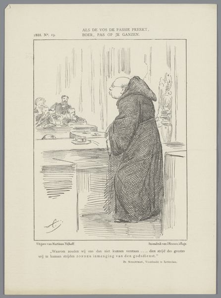 This print, made in 1886 by Johan Michaël Schmidt Crans, engages with the debates around constitutional reform in the Netherlands. It is a relatively modest work, just a simple black-and-white print, likely made with a combination of etching and engraving. The scale and the materials indicate that this was a work intended for mass consumption, distributed through newspapers or pamphlets. The artist’s labor is evident in the intricate lines that define the figure's clothing and the setting. The print's texture and tone are results of the etching process, where acid is used to bite into the metal plate, leaving behind the drawn image. The artist is using his craft as a form of political commentary, speaking directly to the public about the key issues of the day. It cleverly blends high and low culture by referencing the famous "to be or not to be" soliloquy from Shakespeare's Hamlet, but making it about local politics. This democratizes intellectual thought, bringing it out of the theater and into the streets.