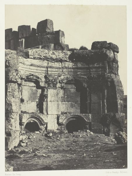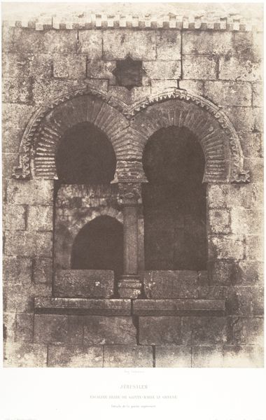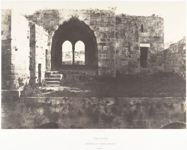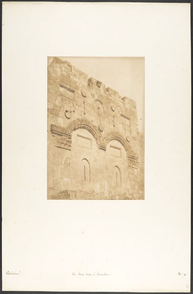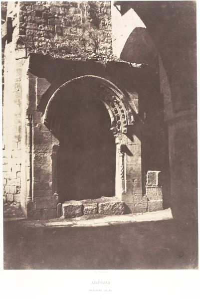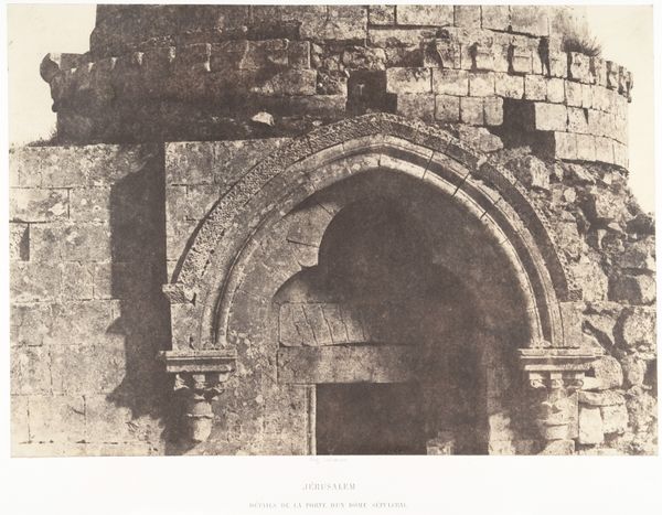 Editor: This is Maxime Du Camp's photograph, "Jerusalem, Golden Gate; Palestine," potentially from between 1849 and 1852. It's a print on paper, part of the Art Institute of Chicago's collection. There's something haunting about the stonework, almost ghost-like in its faded quality. What captures your imagination when you look at this piece? Curator: It whispers of echoes, doesn't it? For me, this image is a powerful meditation on time. Imagine Du Camp, hauling his equipment, a pioneer in photography, capturing this ancient gate. It’s not just a record, it's an encounter across centuries. What stories those stones could tell! Do you see the wear, the little imperfections? Editor: I do! It feels so... real. Not like the polished tourist images you see today. It makes you wonder about who walked through that gate. Curator: Exactly! And consider what the camera itself represents. Here’s a new technology grappling with something timeless. There's almost a sense of humility in how it presents this monumental architecture. Almost like the light itself is aging the picture before our very eyes. What feelings does the monochromatic palette bring to mind for you? Editor: Melancholy, maybe? It emphasizes the age, the feeling that things are crumbling, maybe disappearing... Curator: Perhaps. Or maybe, just maybe, the enduring strength of memory. Photography holds it there and passes it onto us, who gaze back at it with questions. Editor: It’s incredible how a single image can spark so much contemplation. It's made me think differently about the layers of history captured within a single photograph. Curator: Absolutely! The interplay between time, technology, and human experience-- it’s what makes art so captivating, isn’t it?