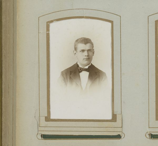 Curator: What strikes me first about this vintage photograph is its quiet dignity. Editor: I agree, there's a stillness, almost a melancholy, emanating from the subject's eyes. It’s like peering into another era, full of untold stories and forgotten expectations. Shall we dive into the specifics? This piece is entitled "Portret van een man, aangeduid als Monsieur Tollenaere", a portrait of a man referred to as Mr. Tollenaere. It dates to sometime between 1880 and 1940 and it uses a photography medium to achieve this realistics image. Curator: Note the soft focus characteristic of pictorialism—almost dreamlike. But consider also the symbolic weight of portraits during this era; to be captured was an act of conferring social importance and status. How does the man's attire speak to the social conventions of his time? Editor: The suit and bowtie suggest a bourgeois identity, fitting within the social expectations of the late 19th and early 20th centuries. But I see something more. This portrait subtly underscores issues around male identity within a rapidly changing social and political landscape. Is he confident, defiant, or constrained by convention? It could all of these at once! Curator: Yes, he appears to be confined into the rigid oval. These types of photographic portrait settings often echoed a desire to fix, and to freeze, a particular social structure as much as any particular subject. Think how photographic technology itself becomes implicated in consolidating specific notions of class. Editor: Definitely. The man’s gaze also creates a feeling of distance. The photograph feels like both a way to hold onto the past and proof that you can never fully capture it. Curator: Precisely. This image resonates through its very tangible engagement with how memory operates—evoking a bygone time, one in which image-making was still invested with social aspiration. Editor: For me, its power lies in how it mirrors the enduring yet evolving struggles around identity and representation, something still relevant today. Curator: A fitting conclusion to our dialogue. This photographic portrait not only preserves a likeness, it invites us to examine the layered narratives of history, identity, and memory that intersect within it.