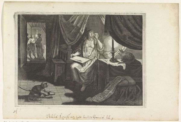 Louis Truchy created this print, Pamela Kleedt Zich Uit, around 1742. It visualizes a scene from Samuel Richardson’s popular novel "Pamela, or Virtue Rewarded," offering a glimpse into the intersections of gender, class, and morality in 18th-century society. The print depicts Pamela, a virtuous servant girl, undressing in a room where her master, Mr. B, lurks in disguise. The setting emphasizes the power dynamics at play, with Pamela vulnerable and Mr. B positioned to take advantage. Truchy’s work reflects the period's fascination with the novel's exploration of social mobility and female virtue and sexuality. The emotional tension is palpable; Pamela's poised demeanor contrasts sharply with the hidden intentions of Mr. B, inviting viewers to reflect on the complexities of consent and resistance. Truchy’s print not only illustrates a key moment in the narrative but also encapsulates the anxieties and aspirations of a society grappling with changing social norms.
