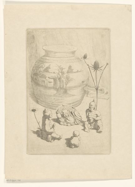 Curator: Here we have Theo Nieuwenhuis's drawing, "Twee Stuks Perzisch Aardewerk" or "Two Pieces of Persian Pottery", made sometime between 1876 and 1951. Editor: The immediate impression is one of gentle, almost hesitant lines. The pen and ink work captures the objects, but there’s a delicate fragility to the rendering. Curator: Indeed, Nieuwenhuis was known for his delicate touch, characteristic of the Art Nouveau style. We see two vessels, sketched with an almost dreamlike quality. Consider the lower vase; a stylized bird is prominently displayed, surrounded by foliage. Birds, often seen as messengers, hint at deeper narratives. Editor: Note the interplay between the solidity of the forms and the ephemeral quality of the hatching and cross-hatching. Observe the negative space—it’s as important as the drawn lines themselves in defining the shape. The objects are floating, unmoored from any real setting. Curator: The lack of background draws the viewer’s attention entirely to the objects. This directness makes us focus on what they represent. In Persian pottery, certain symbols reappear; each possesses meaning. The birds could signal the soul’s journey. Editor: True, but how he renders shadow offers so much—he’s captured the texture through tonal gradations alone. It would have been tempting to render smoother forms. His approach elevates the sketched above pure documentation. Curator: Nieuwenhuis was capturing not just forms but echoes of design. This act of documentation shows a respect for design traditions from the East. There is cultural reverence at play. Editor: Well observed! Looking more closely now I notice an interplay in terms of texture: that delicate lip where the plate curves into a slim vase. Curator: A dance of line and light that carries echoes across time. Editor: The sketch offers up multiple ways to view simple objects in this museum collection.