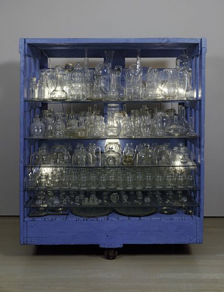 Curator: Standing before us is Claes Oldenburg’s "Pastry Case" from 1961, a mixed-media assemblage employing ceramic within a glass case. Editor: It looks like a warped confectionery fever dream, doesn’t it? These bulbous, vaguely cake-like forms crammed into this clinical display case. There's something unsettling, yet humorous, about the contrast. Curator: Indeed. Oldenburg’s deliberate use of crude, hand-modeled ceramic challenges our perception of the pristine, mass-produced objects we associate with consumer culture. Consider how the work's materiality subverts traditional notions of fine art by highlighting the artist's hand and the often-overlooked labor involved in the making and consumption of pastries. Editor: I see the tension, particularly how he plays with scale and texture. Look at the drippy glaze; it's meant to evoke the tantalizing appeal of frosting, but its execution feels… visceral, almost grotesque. The way the "cakes" are constructed reminds you they were worked on, almost assembled like garbage—something is revolting. This act emphasizes that ordinary, consumable object could transform into uncanny subjects. Curator: It's Pop Art's reinterpretation of everyday materials! He aimed for something visually interesting by repeating shapes, with subtle asymmetries across the case itself, and in each so-called pastry, producing unity. Each cake seems barely to avoid spilling and being dispersed throughout the showcase; is it beautiful? I wouldn't dare argue it! Editor: I would say he explores the seduction and repulsion inherent in the consumption culture of the 1960s. The materials highlight the often unseen processes behind the sweet surface, almost a raw examination of capitalist abundance and its less appealing side. I cannot unsee this sculpture now... Curator: By choosing "ugly" and readily available craft material such as ceramic and combining it with "high" art practice—such as glass cases—Oldenburg effectively questions traditional hierarchies. Editor: Quite subversive and insightful how he challenges us to look closer at our surroundings. Curator: Absolutely; a striking piece with strong visual language and intellectual complexity. Editor: Agreed, it definitely leaves a lingering taste.