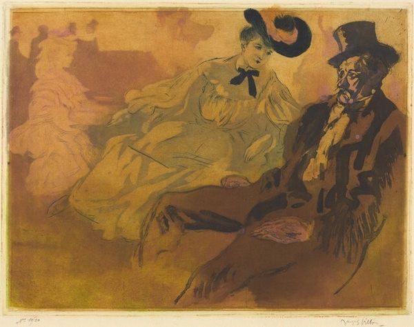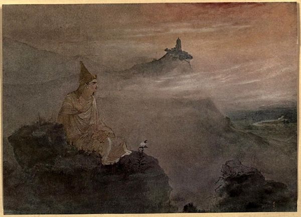 Curator: What strikes me immediately is the monumentality, the feeling that time itself is rendered solid in this image. Editor: It’s melancholic too, don’t you think? The muted palette, the kind of sleepy resignation on the face… almost like a landscape holding its breath. Curator: Well, let’s add some context then. We're looking at a work by Ivan Bilibin, entitled "The opera 'Ruslan and Ludmila'", dating back to 1900. It is a watercolor and ink piece. And indeed, you feel that weight, as the figure could embody pagan entities slumbering until called again. Editor: Slumbering is perfect! You can feel the centuries settling into the stone, or rather, in Bilibin's delicate watercolouring, hinting at legends whispered between generations. I love the suggestion of latent power in this, how he manages to give the impression that a whole story rests inside the image! Curator: Notice, too, how the face—a massive, stoic visage—is framed by craggy rocks, integrating the figure into the geological timeline. The crown could suggest regal power, but instead its ornamentation speaks to me of shamanic tradition or ancient wisdom. The symbol suggests the past. Editor: It is such a dreamscape! But that blending is what gets to me. Bilibin uses color like a veil, that landscape breathes. Does it call up specific folkloric memories? Or something about Russian identity at the dawn of the century? Curator: Definitely Russian identity, but filtered through a very deliberate artistic lens. Bilibin helped define what later became the Russian Avant-Garde style—a national revival using folklore, and popular belief to form a new aesthetic. What resonates most deeply for me is the piece's grounding in both material culture and shared memory. Editor: For me, this whispers about the deep currents under what we think of as progress— those stubborn things, old feelings, the memories held in land, that just…remain. Curator: A subtle yet impactful reminder of history made visual. Editor: Absolutely. Thank you.